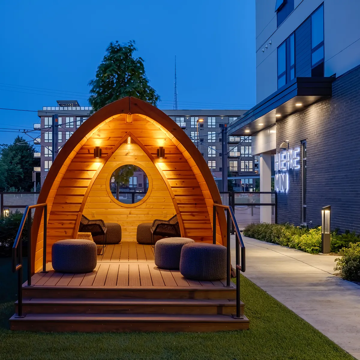From the expansive courtyard with game lawn, grilling patio, and cozy glamping pods to our high-end fitness center, our amenities offer a number of ways to connect, engage, and relax. Host a barbecue at the grilling area, practice your moves in the game room, and take in stunning views of Minneapolis from the rooftop deck and sky lounge.